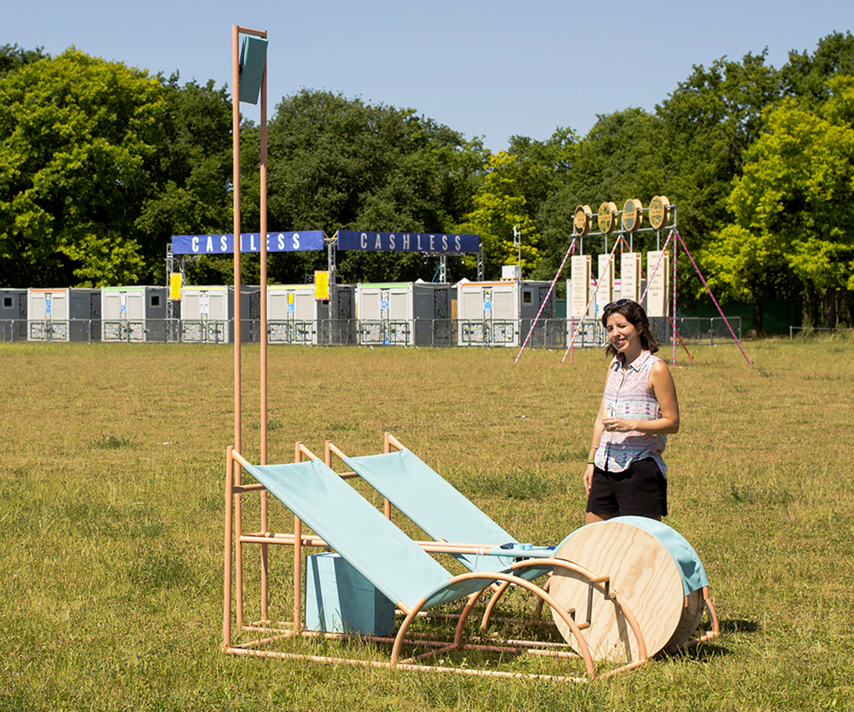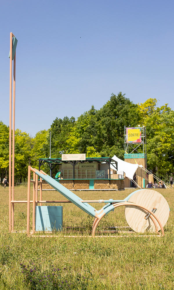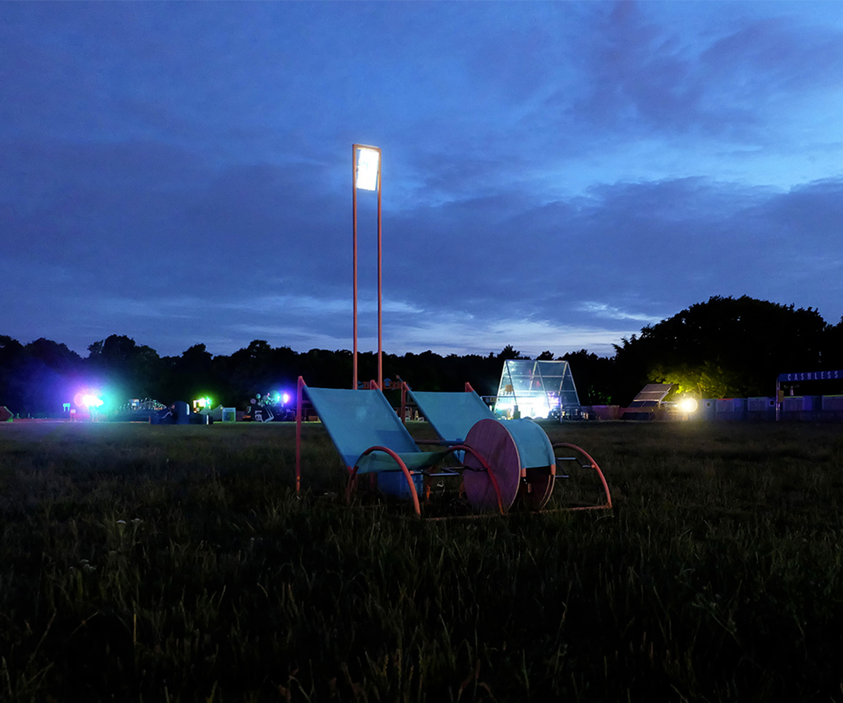 Pédalo dynamo est le fruit d’un imaginaire estival où l’énergie relative aux différents besoins des festivaliers (charger son téléphone, s’éclairer…) est produite sans trop d’effort. Ainsi, Pédalo dynamo nous conte le mariage d’un paysage pédaluresque avec une technologie mécanique d’antan mais toujours utilisée: celle de la dynamo et du vélo.